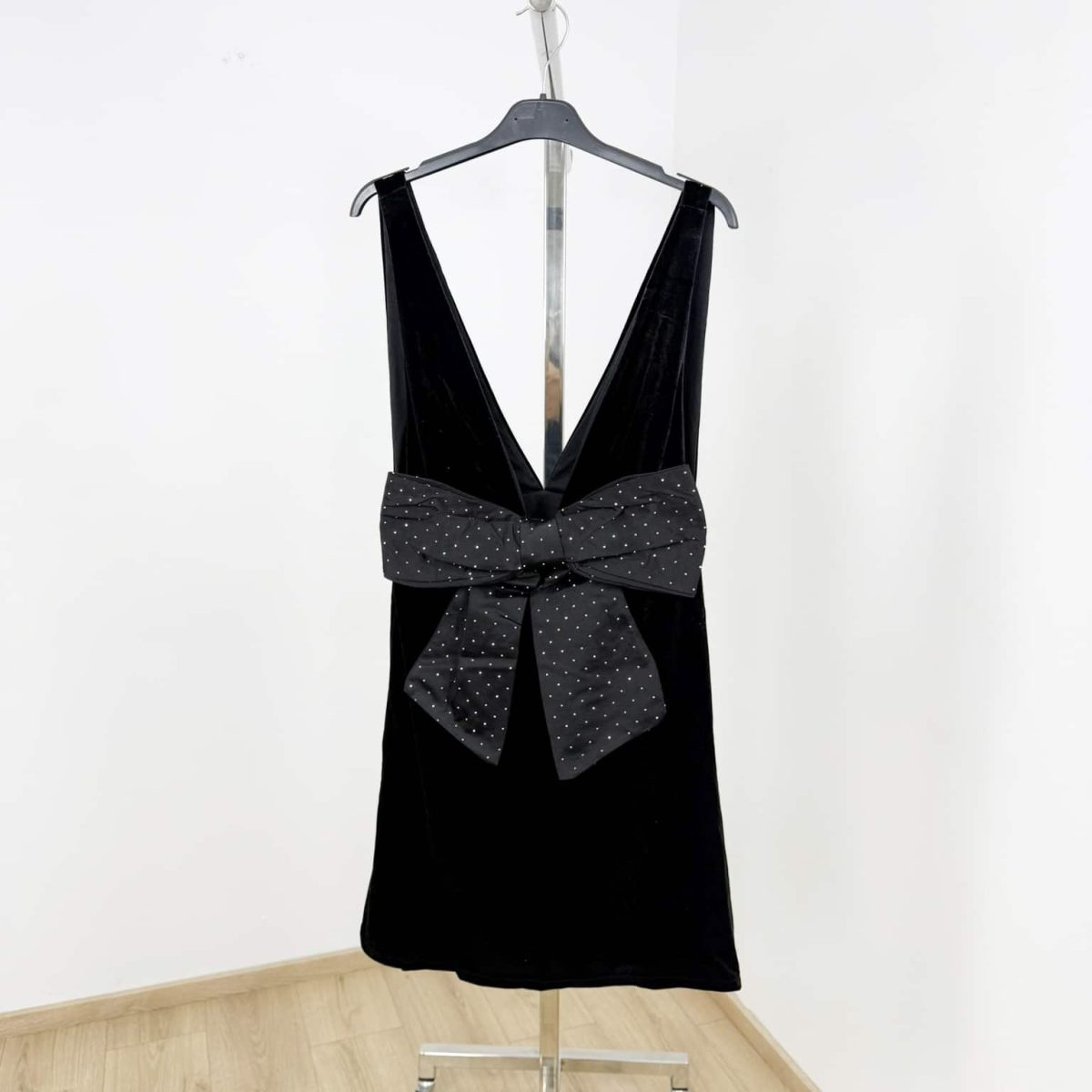 The standout feature is its oversized bow detail at the back, delicately embellished with sparkling crystals. Its deep V-neckline and open back create a bold, feminine look, while the mini length adds a youthful and modern twist. Available in classic black or romantic red, this dress is the perfect choice for cocktail nights, parties, and festive celebrations.