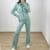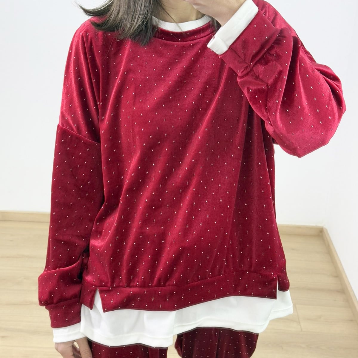 This set is a chic and relaxed two-piece ensemble made from a soft, velvety fabric. The top features a loose-fit sweatshirt style with subtle studded detailing that adds sparkle and elegance. The matching pants have a comfortable, tapered fit, perfect for lounging or casual outings. The layered effect at the cuffs and hem of the top adds a stylish touch, enhancing its modern design.