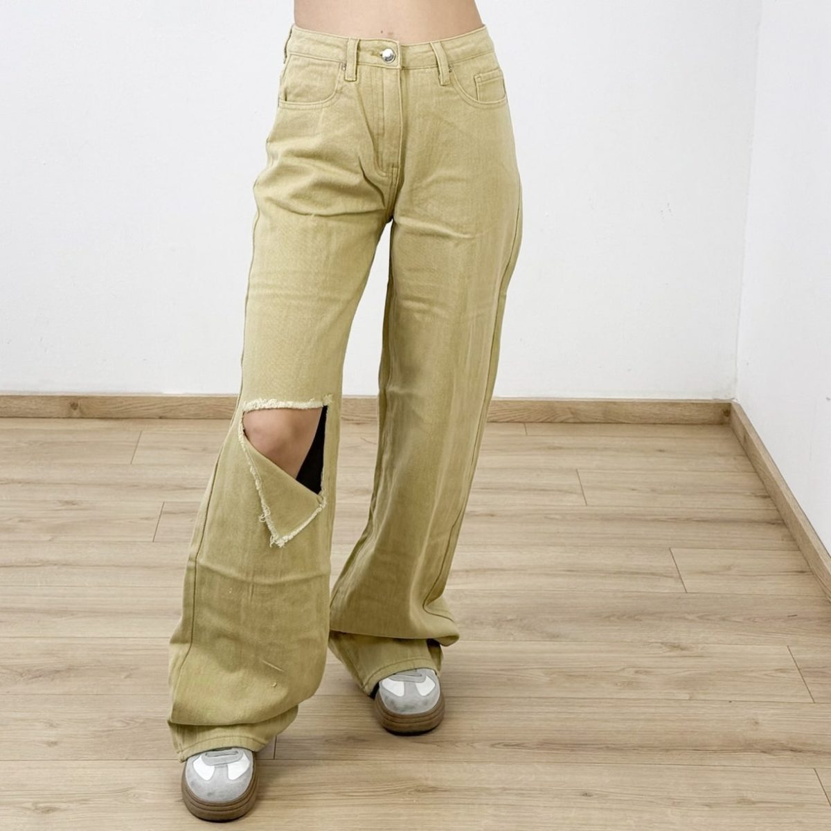 Make a bold fashion statement with these wide-leg distressed caramel jeans. Featuring a trendy oversized ripped detail on one leg, a relaxed fit, and a high waist for flattering comfort, these jeans blend streetwear edge with everyday wearability. Perfect for pairing with crop tops, oversized tees, or hoodies for a laid-back, cool look.