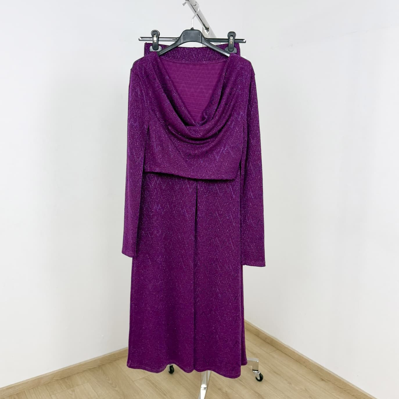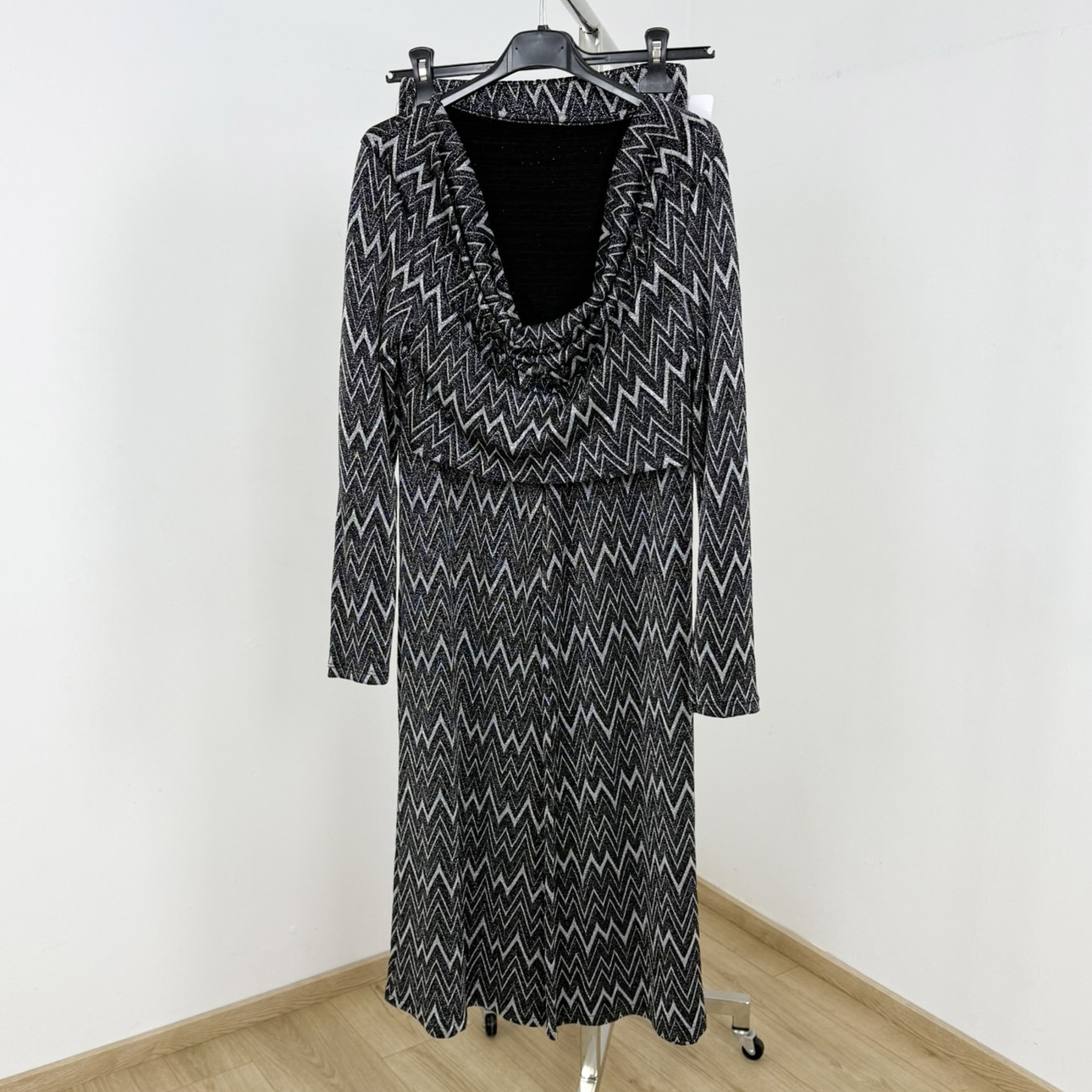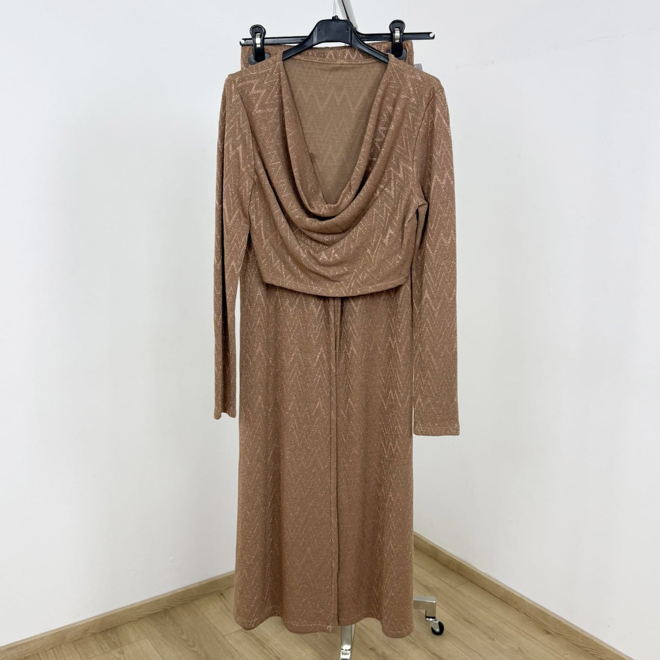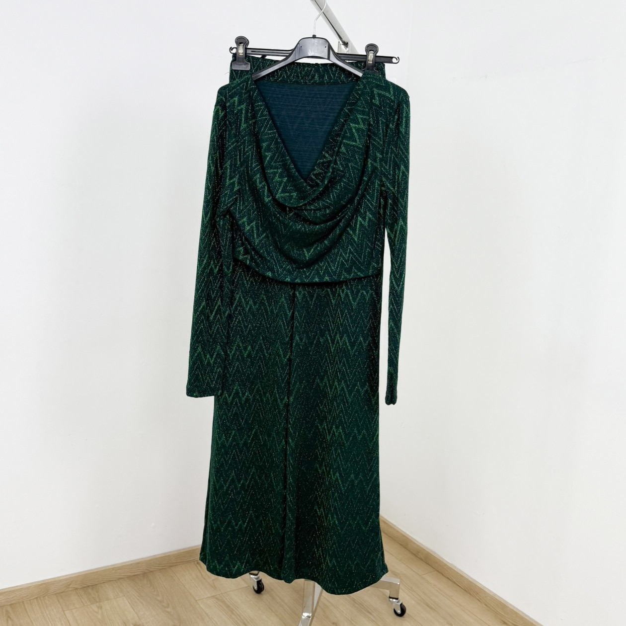 Elevate your style with this stunning zigzag-patterned co-ord set, featuring a soft cowl neck top and flattering high-waisted wide-leg pants. Designed for effortless elegance, this ensemble blends comfort with glam thanks to its subtly shimmery fabric and flattering silhouette. Perfect for special occasions, evenings out, or making a statement at work. Available in a range of rich, fashion-forward colors.